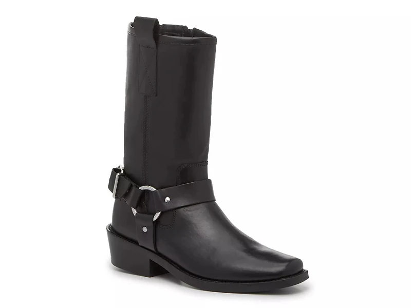 What they are: A pair of moto-inspired boots, complete with a strappy design, a buckle accent, and a circular silvertone detail.