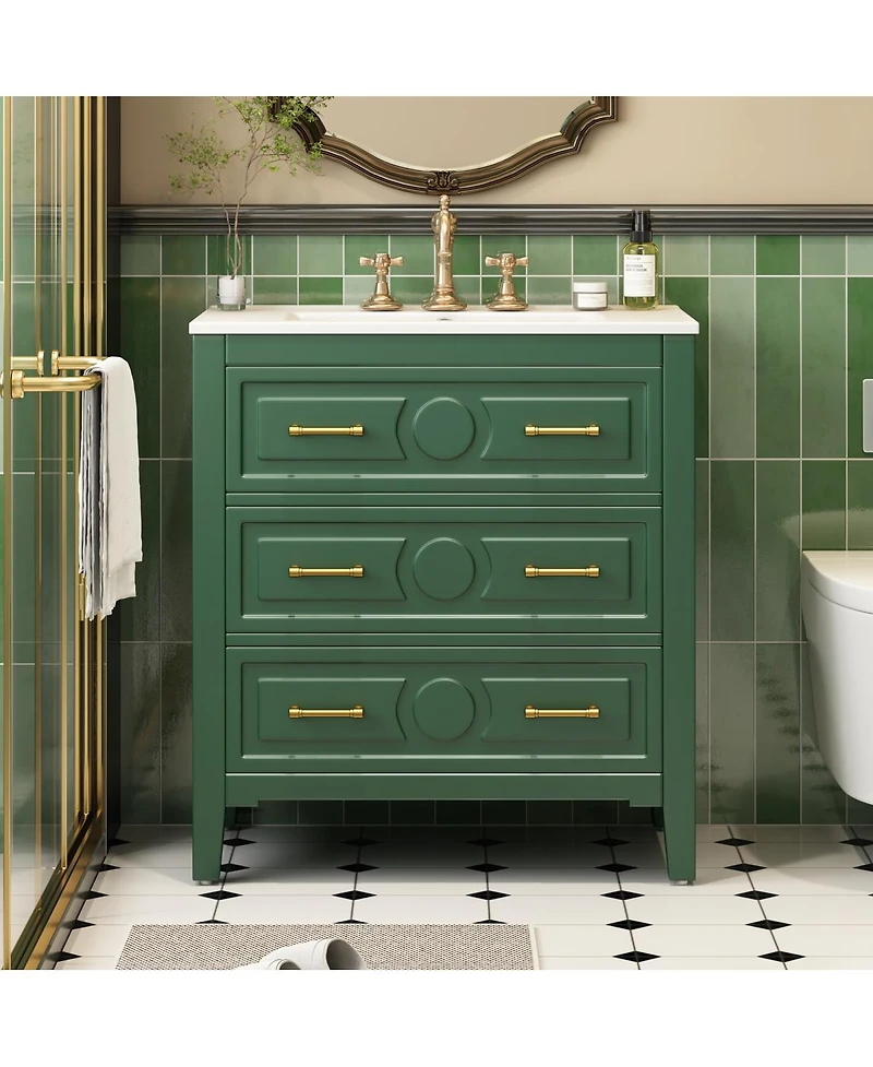 Bring timeless elegance and smart storage to your bathroom with this 30-inch retro vanity. Crafted from solid wood and high-quality Mdf, it features a durable, glossy ceramic sink that s easy to clean and resists water stains. The three spacious drawers offer ample concealed storage for all your bathroom essentials, keeping your space tidy and organized. Each drawer glides smoothly with soft-close hinges, protecting both the cabinet and your peace of mind. Exquisite carved details and gold metal handles lend a classic, sophisticated look that instantly elevates any decor. The pre-drilled basin is ready for your favorite faucet, while the sturdy construction ensures long-lasting use. Designed to fit smaller spaces without sacrificing style or function, this vanity is the perfect update for any bathroom seeking both charm and practicality.