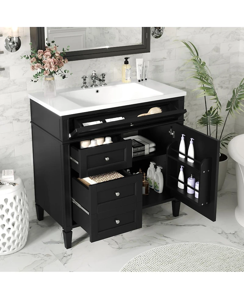Transform your bathroom with this 36-inch modern vanity, crafted for both beauty and efficiency. The smooth resin sink offers a seamless, easy-to-clean surface that resists stains and water spots, ensuring a fresh look every day. Durable solid wood and Mdf construction guarantees stability and long-lasting use, while the freestanding design brings versatility to any space. Stay organized with a spacious cabinet featuring adjustable shelves and multiple drawers, perfect for storing toiletries, towels, and daily essentials. The tip-out drawer and built-in door organizer make it easy to access small items and maximize every inch of storage. Sleek hardware and a minimalist profile add a touch of elegance, blending effortlessly into contemporary or classic decor. Assembly is quick and straightforward with labeled parts and clear instructions. Make your bathroom more functional and stylish with this thoughtfully designed vanity.