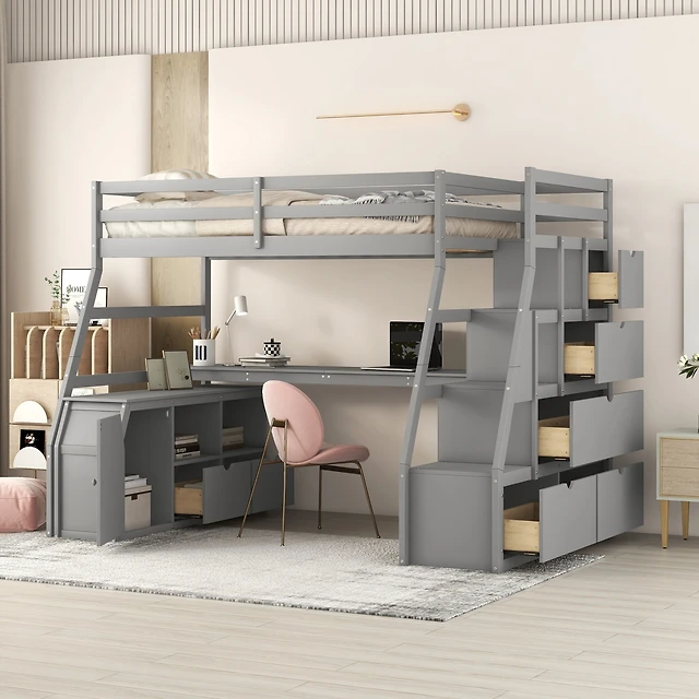 Simplie Fun Full Loft Bed With Desk And Shelves, Two Built-In Drawers, Storage Staircase, Gray