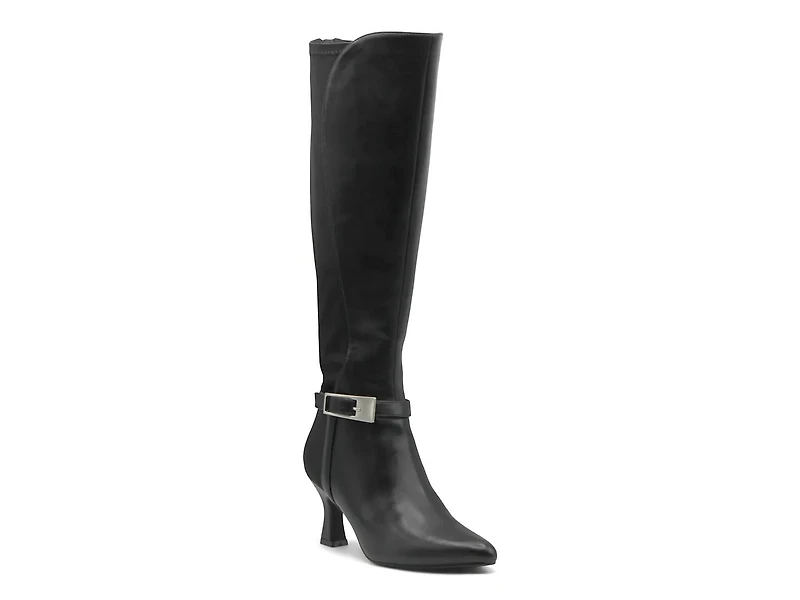 The Sindah pump from Adrienne Vittadini adds daringly chic style to your cool weather looks thanks to its decorative buckle accent, 50/50 mixed material upper, and flared heel. This knee high boasts clean lines, a convenient back zipper, and a stretch fabric calf for added room to wear over jeans or leggings.