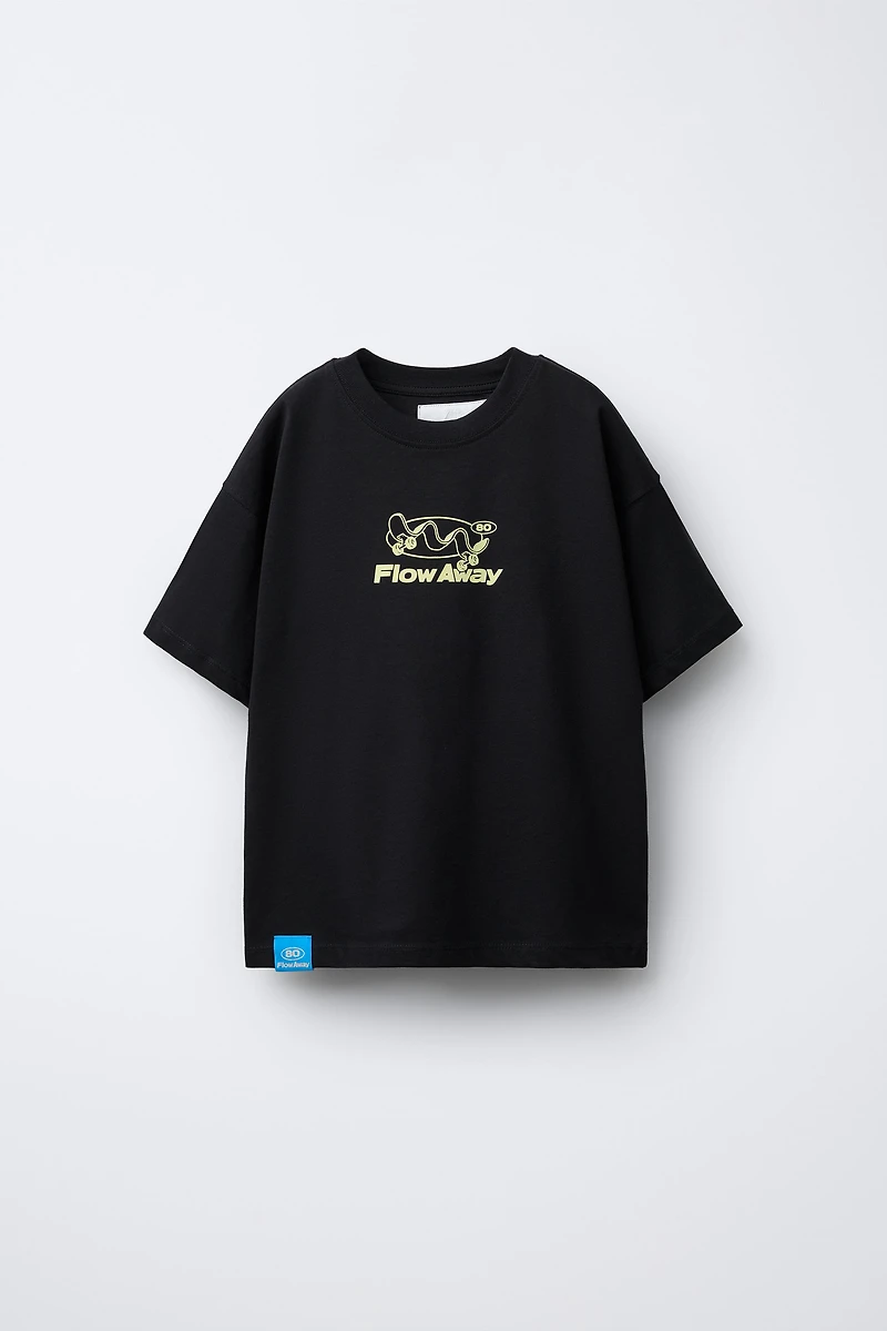 Round neck, short sleeve T-shirt. Skate print on the front and back. Label appliqué on the hem.