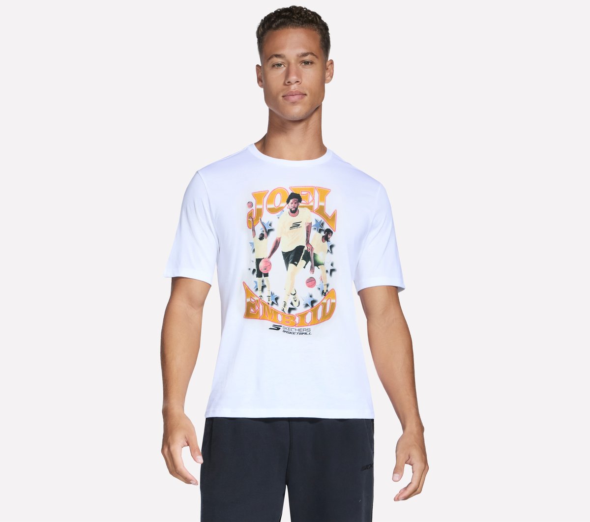 Comfort unlocks peak performance and athletic style with Skechers Basketball®: Joel Tee. Made from 100% breathable cotton, this tee features a front graphic celebrating Skechers Pro Athlete Joel Embiid.