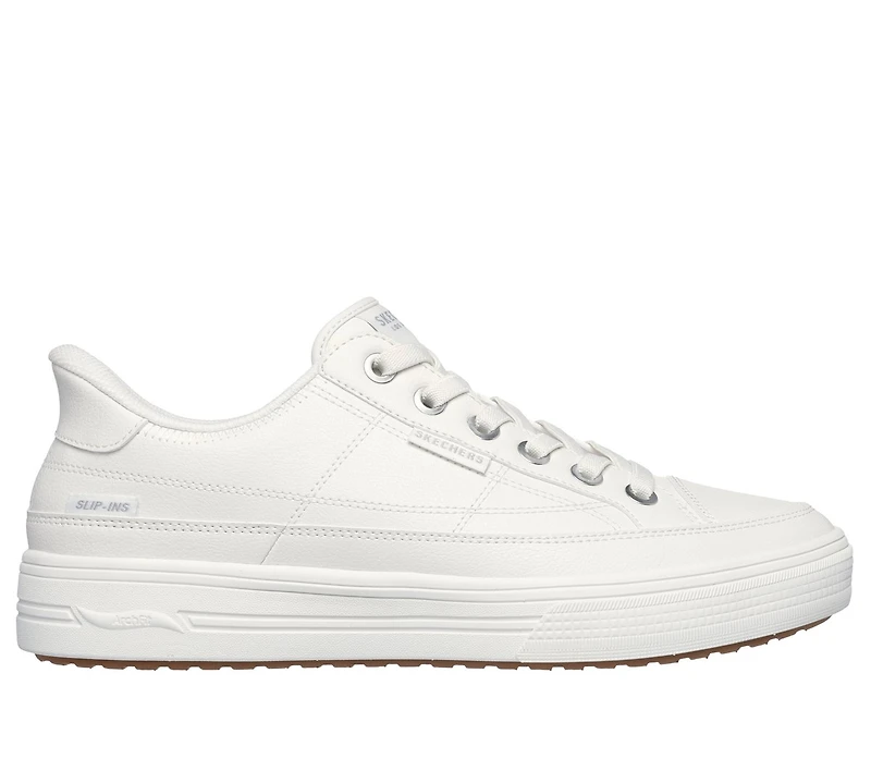 Stroll through the day in amazing cushioned comfort wearing Skechers Hands Free Slip-ins® x Skechers Street™ Arch Fit® Arcade - Catch Ya There. This casual slip-on sneaker has been granted the APMA Seal of Acceptance and features a duraleather upper with stretch laces, a removable Arch Fit® insole, and a lightweight cushioned midsole.