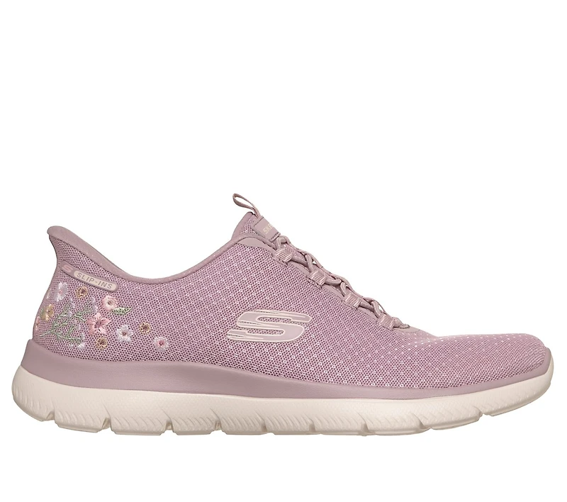 Add a little 'spring' to your step with the effortlessly comfortable Skechers Hands Free Slip-ins®: Summits - Spring Blossom. Designed with our Heel Pillow®, this vegan slip-on features a mesh upper with fixed stretch laces, floral heel counter embroidery, and a cushioned Skechers Air-Cooled Memory Foam® comfort insole.