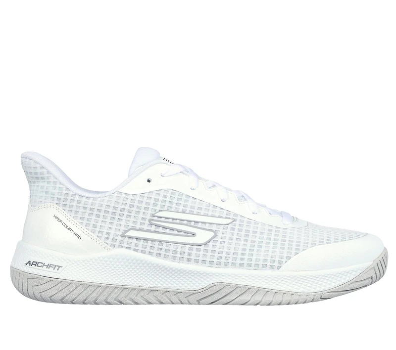 Play your best game in confidence and comfort with Skechers Viper Court Pro - Pickleball. Designed specifically for the elite Pickleball athlete, this lace-up features a supportive and breathable mesh upper with synthetic overlays for additional protection, a removable Arch Fit® insole, and lightweight ULTRA FLIGHT cushioning. The design is complete with a Goodyear® Gold compound outsole that's built for increased durability to allow the elite player to perform controlled slides specifically on the pickleball court surface.