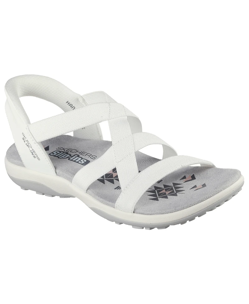 Go adventuring in the airy comfort of these Skechers Women's Slip-ins: Reggae Slim - Stretch Flex Athletic Walking Sandals. Crafted entirely from this strappy sport sandal features a serenely soft fabric upper, a cushioned contoured insole, and an Exclusive Heel Pillow to keep your feet feeling secure and supported every step of the journey ahead.