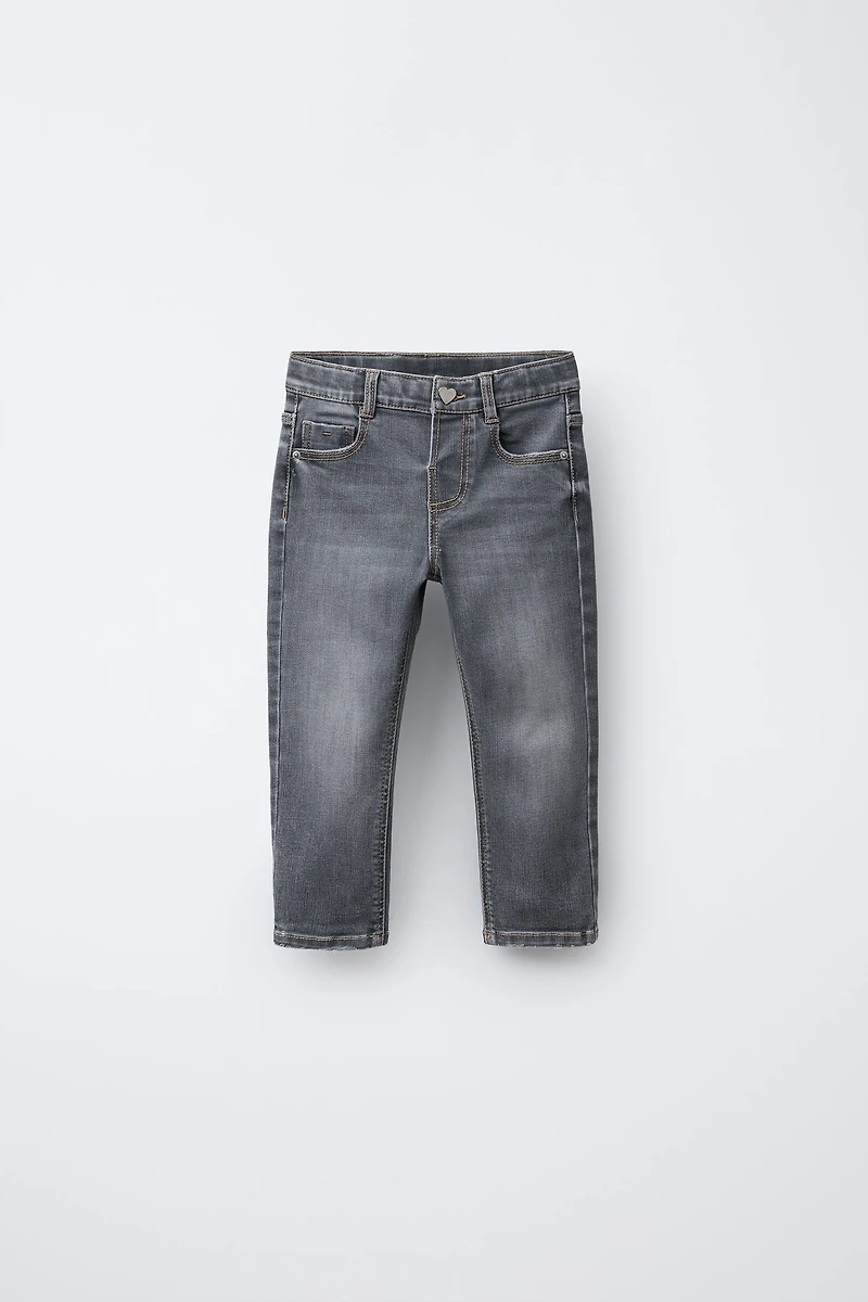 Skinny denim pants with adjustable inner waistband and front heart-shaped snap button closure. Front pockets and patch pockets on the back.