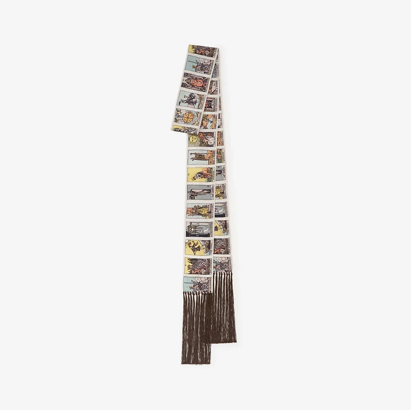 A skinny scarf made in Italy from silk poplin with exaggerated knotted fringing. Reimagining Edwardian tarot cards, the design is printed with esoteric designs inspired by British artist Pamela Colman Smith.​