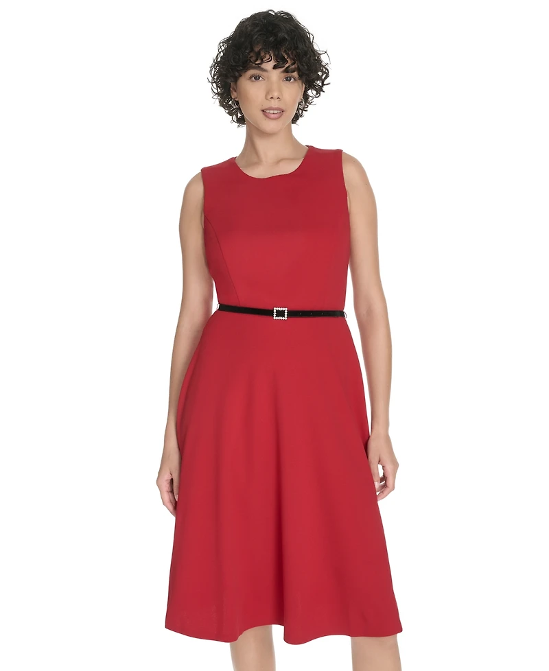 Be the stylish one in this Tommy Hilfiger fit and flare midi dress, featuring a belted waist that creates a feminine silhouette and a classic crewneck. Finished with a back zipper closure, it's suitable for everything from work events to weekend celebrations.
