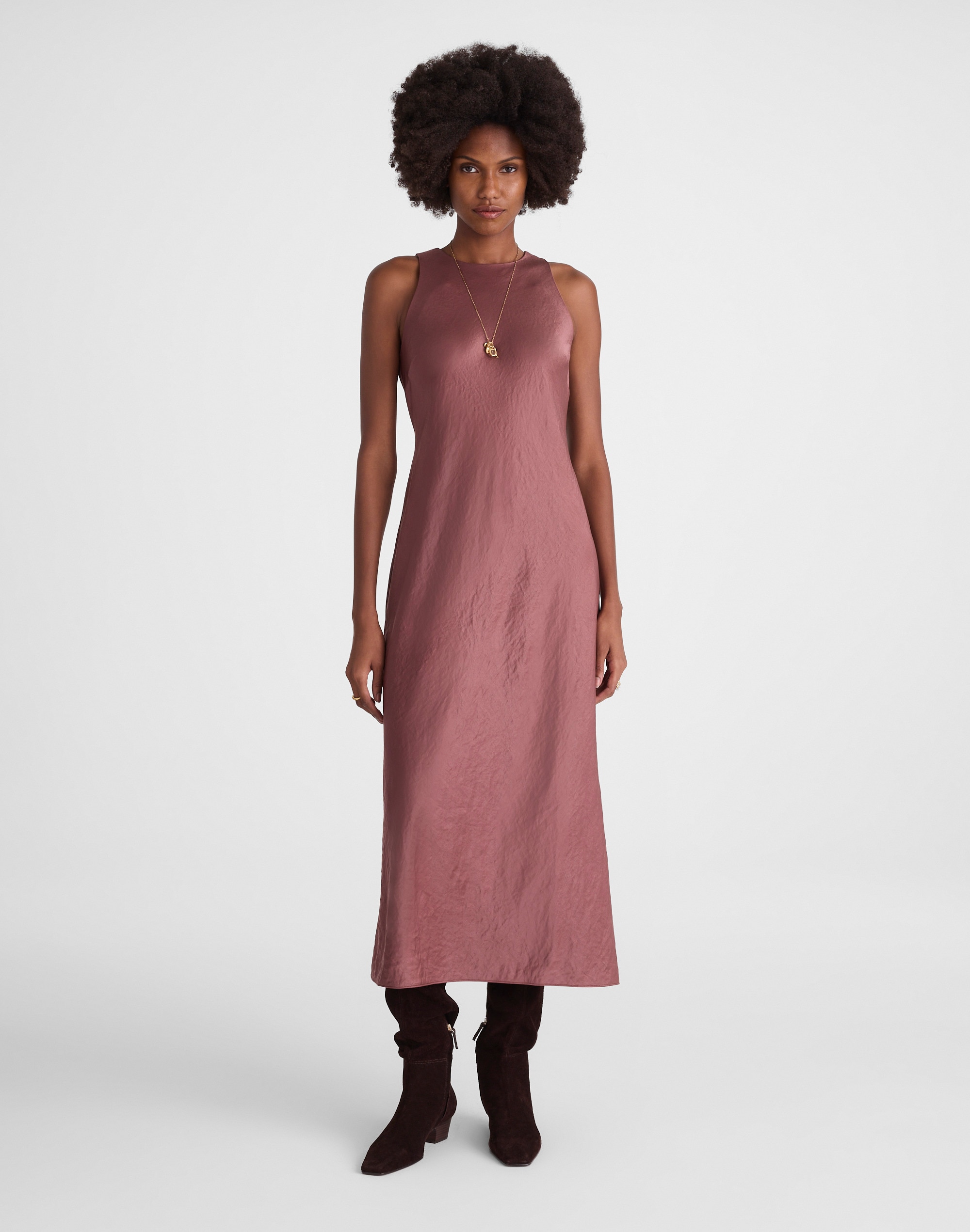 Perfectly drapey in partially recycled satin, this sleeveless maxi dress has a flattering slim fit, jewel neckline and long, flowy skirt. A dream to dress up or down.