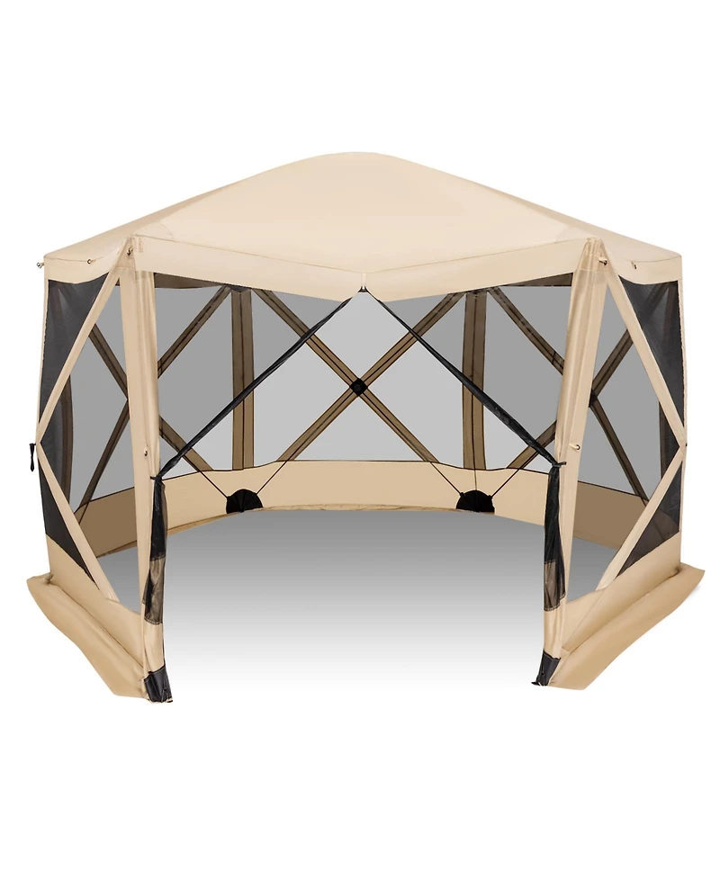 The camping gazebo screen tent adopts a unique pop-up structure, therefore it can be instantly set up in 1 minute, requiring no tools. All you need to do is pull the support hub straps on each side panel to spread out the tent, push upward the top center hub until it is locked into positions, and then install the door frame poles and fix them with straps.