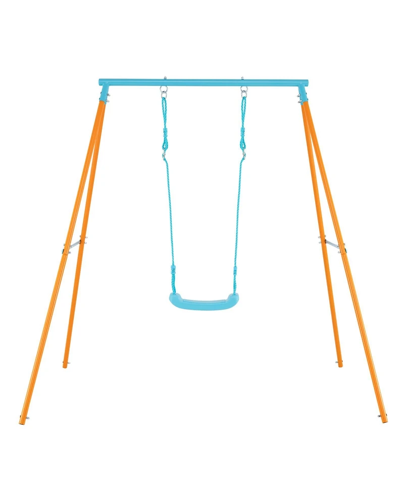Create a safe and fun outdoor play zone with this heavy-duty metal toddler swing set, complete with a stable stand for secure setup. Designed for young children, the swing features a supportive seat with safety harness and high backrest to keep toddlers comfortably in place while they play. The powder-coated metal frame offers strong, weather-resistant support for long-lasting use in backyards or play areas. Easy to assemble and low maintenance, this swing set provides hours of active fun while giving parents peace of mind. Whether set up on grass, patio, or playground surface, it delivers a reliable and engaging addition to your child s outdoor routine.