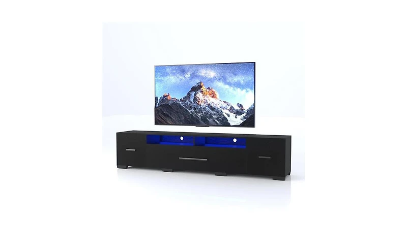 Enhance your entertainment setup with this modern Tv console designed to fit TVs up to 80 inches. This stylish console features ample storage, integrated Led lighting, and innovative app control, allowing you to customize your viewing experience with ease. With full Rgb color options and 31 dynamic lighting modes, this console not only serves a functional purpose but also adds a vibrant atmosphere to your living space.
