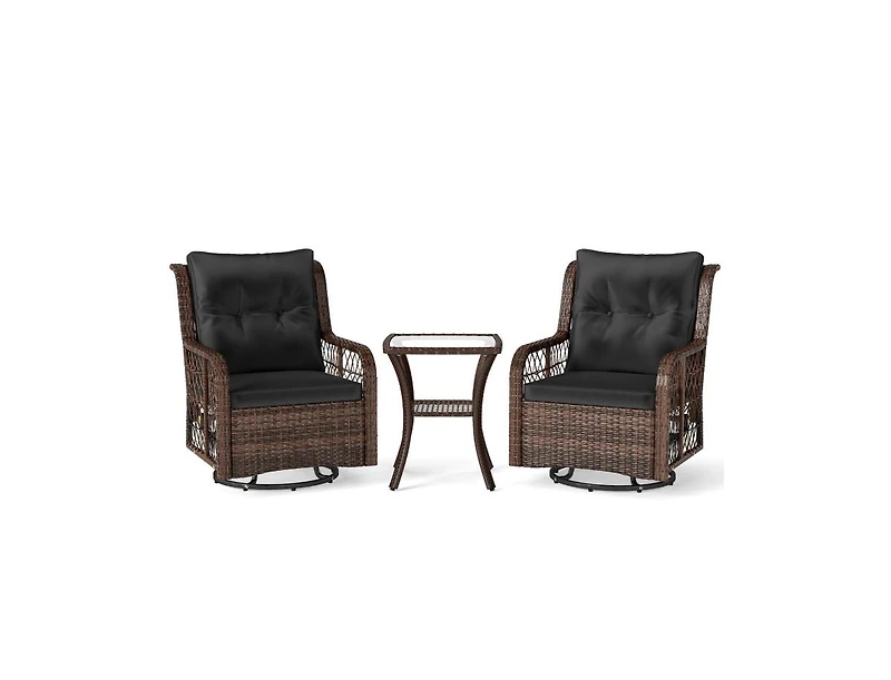 Enhance your outdoor living space with this 3-Piece Patio Furniture Set with Swivel Glider Chairs, 2-Tier Side Table, and Cushions. The set includes two swivel glider chairs that offer a smooth gliding motion and a full range of motion for relaxed seating, while the 2-tier side table provides ample space for drinks, snacks, and decorative items. Soft cushions add comfort, making it perfect for lounging, socializing, or enjoying a quiet afternoon. Crafted with durable materials for outdoor use, this set combines functionality, style, and comfort, ideal for patios, decks, or garden spaces.