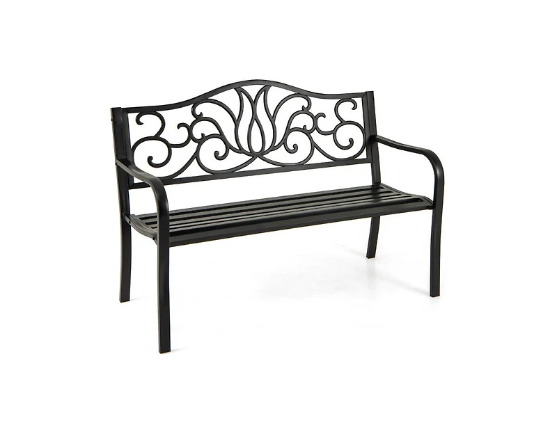 Ensure stable and reliable support with sturdy metal construction Come with strong loading capacity of up to 660 lbs Anti-slip foot pads for additional stability The floral scroll design makes it a visually appealing addition to your outdoor setting Set up to 2-3 people making it ideal for gatherings or quiet moments 105A° inclined backrest cozy armrests and contoured seat for ergonomic support Breathable slatted surface for a comfortable and cool seating experience Suitable for patio garden deck front porch balcony and backyard Please avoid rain exposure for prolonged service life Make it safe to sit thanks to the protective caps 3-step simple assembly for time-saving and labor-saving Specification: Color BlackMaterial Metal Cast IronOverall Dimensions 50" x 24" x 35"Seat Sizes 48" x 16"Seat Height 16"Net Weight 30 lbsWeight Capacity 660 lbsBox Qty 1(May vary by batch)