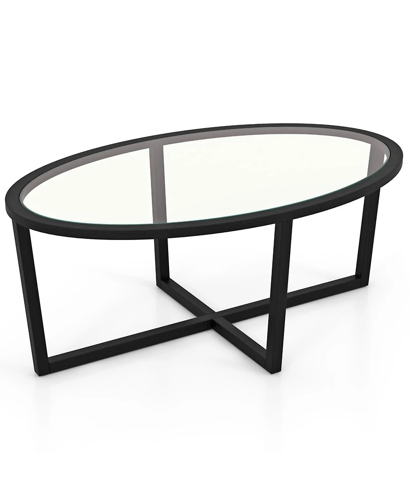 Slickblue Oval Glass Coffee Table with Cross Base Wood Legs