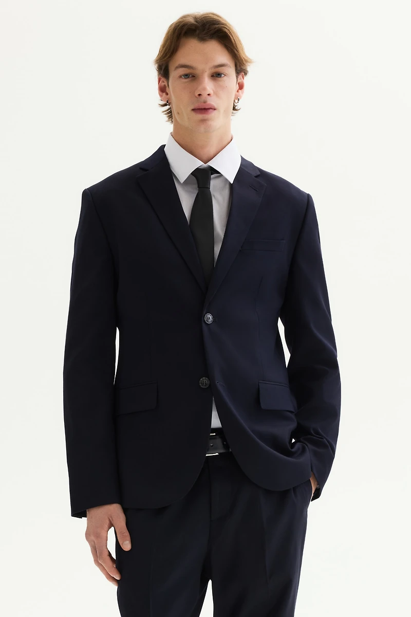 Slim-fit, single-breasted jacket in soft, woven fabric with a fitted silhouette. Narrow notched lapels with a decorative buttonhole, two buttons at front, and decorative buttons at cuffs. Welt chest pocket, front pockets with flap, and two inner pockets. Double vent at back. Lined.