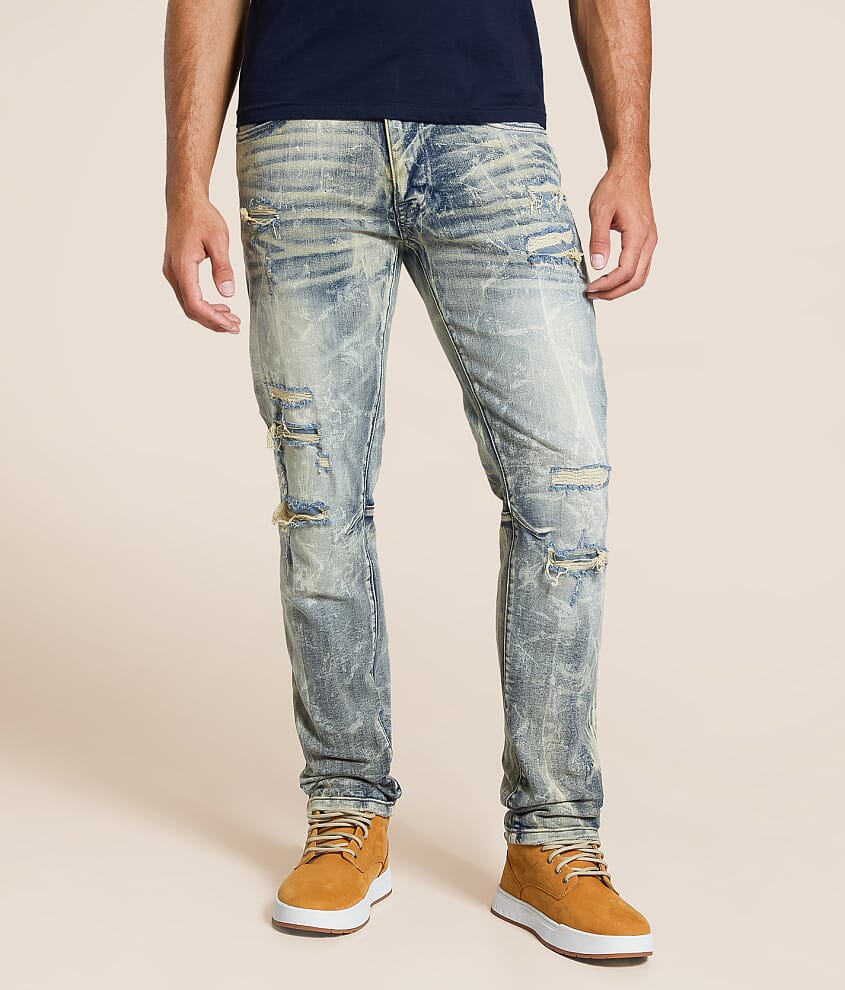 Slim fit jean Comfort stretch fabric Straight from knee to hem Mid-rise, 16" bottom opening Destruction and denim backing details Zip fly Due to the unique wash process there will be a color variance with each piece