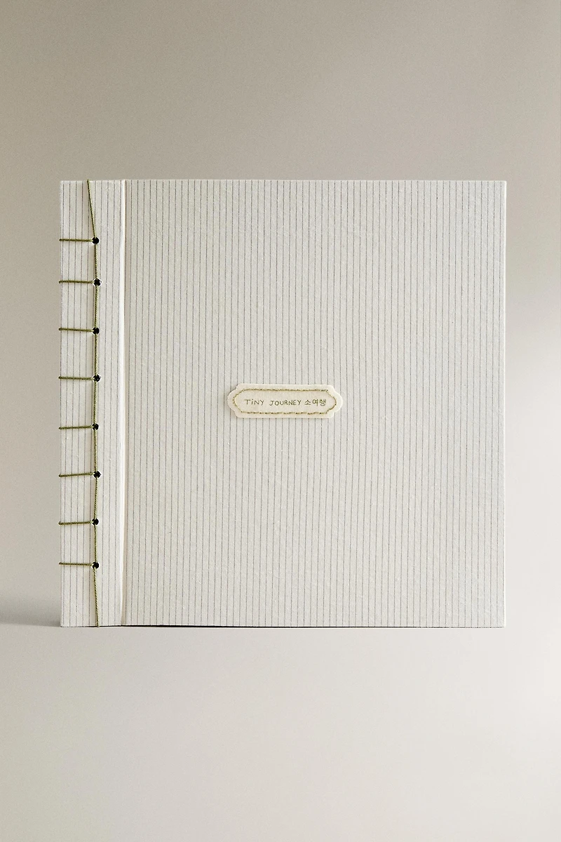 Small-format children's album designed to preserve baby's photos and memories, composed of 30 pages of rigid paper with silk paper sheets with a small dot pattern between each page that protect the images and prevent them from sticking over time, offering a careful presentation and a delicate finish.