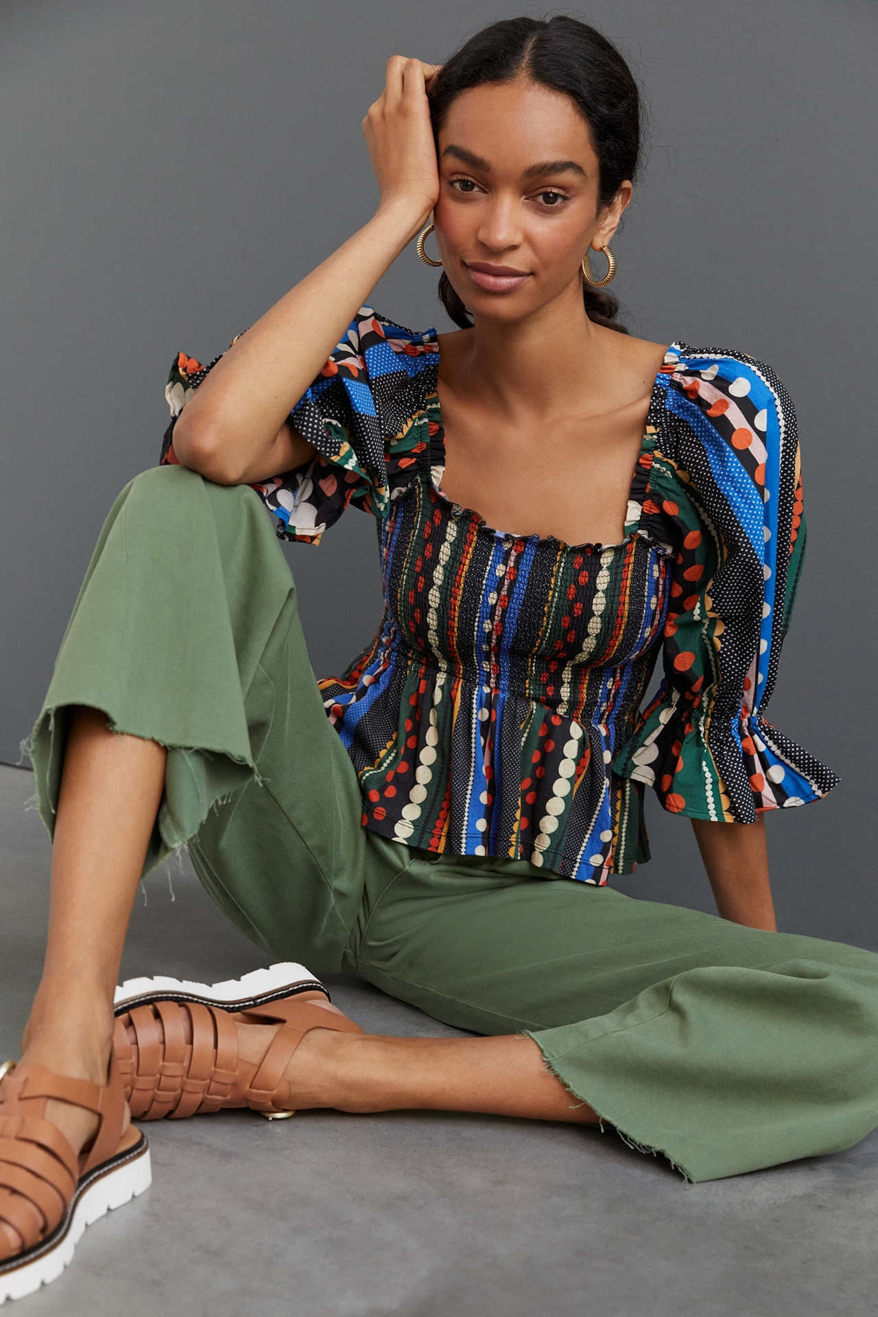 When designing for her contemporary clothing line Conditions Apply, founder Diana Irani uses the Japanese "Wabi Sabi" approach - finding beauty in imperfection. Diana chooses to celebrate each fabric's weathered details and uniquely placed embellishments to evoke a one-of-a-kind, worn-in feel with every piece. Her illustration-style prints and textural finishes contrast beautifully with her modern cuts, for closet additions that will earn you compliments aplenty.Overflowing with captivating details — from a sweetheart neck and puffed sleeves to a smocked bodice — this blouse is ready for its autumn close-up. **About Conditions Apply**