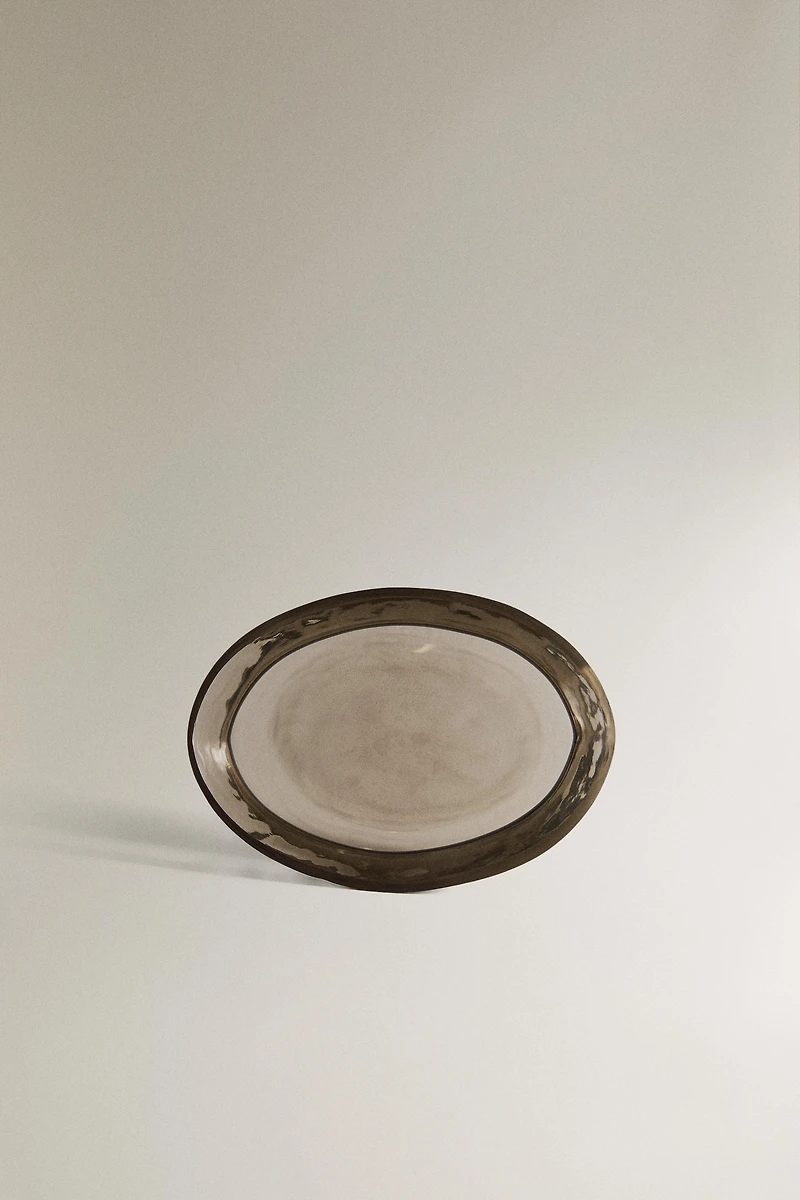 Bathroom soap dish made of glass with an embossed texture and a smoked brown finish. It features an oval shape with raised edges, a stable base, and a surface decorated with irregular reliefs.