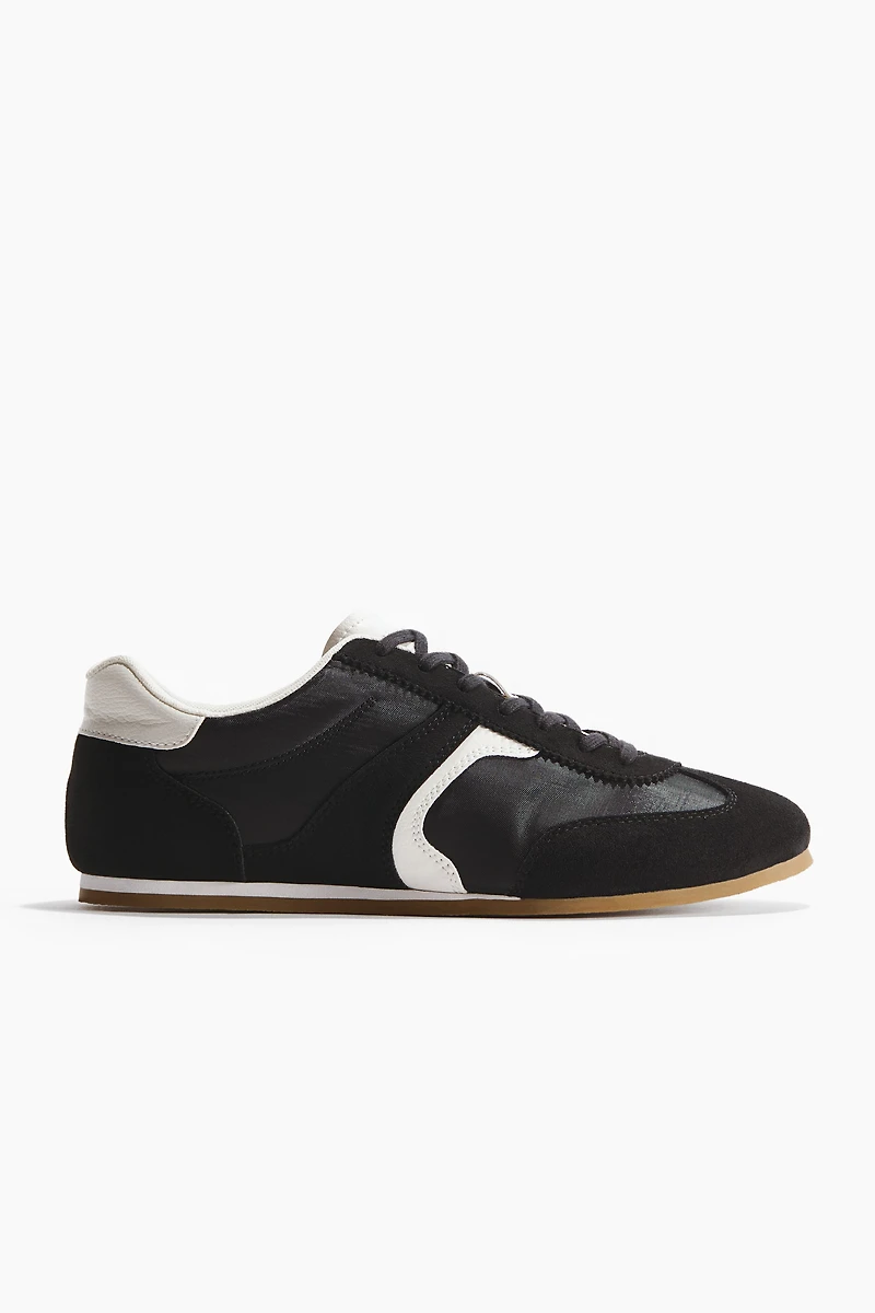 Sneakers with a padded top edge, a tongue, and lacing at front. Patterned soles.