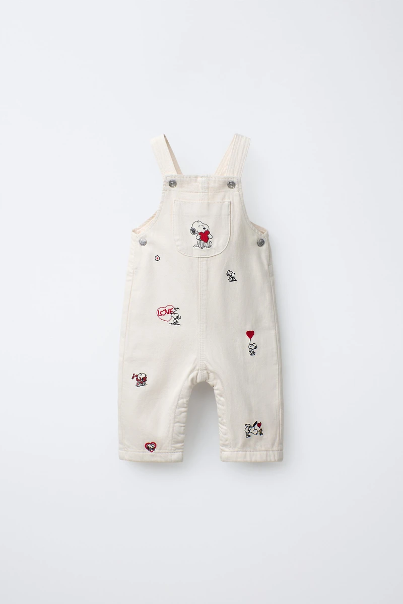 Long overalls with a straight neckline and straps with front snap button closure. Patch pocket on the front and back. Snap button closure at the bottom. SNOOPY PEANUTS™ embroidered details.