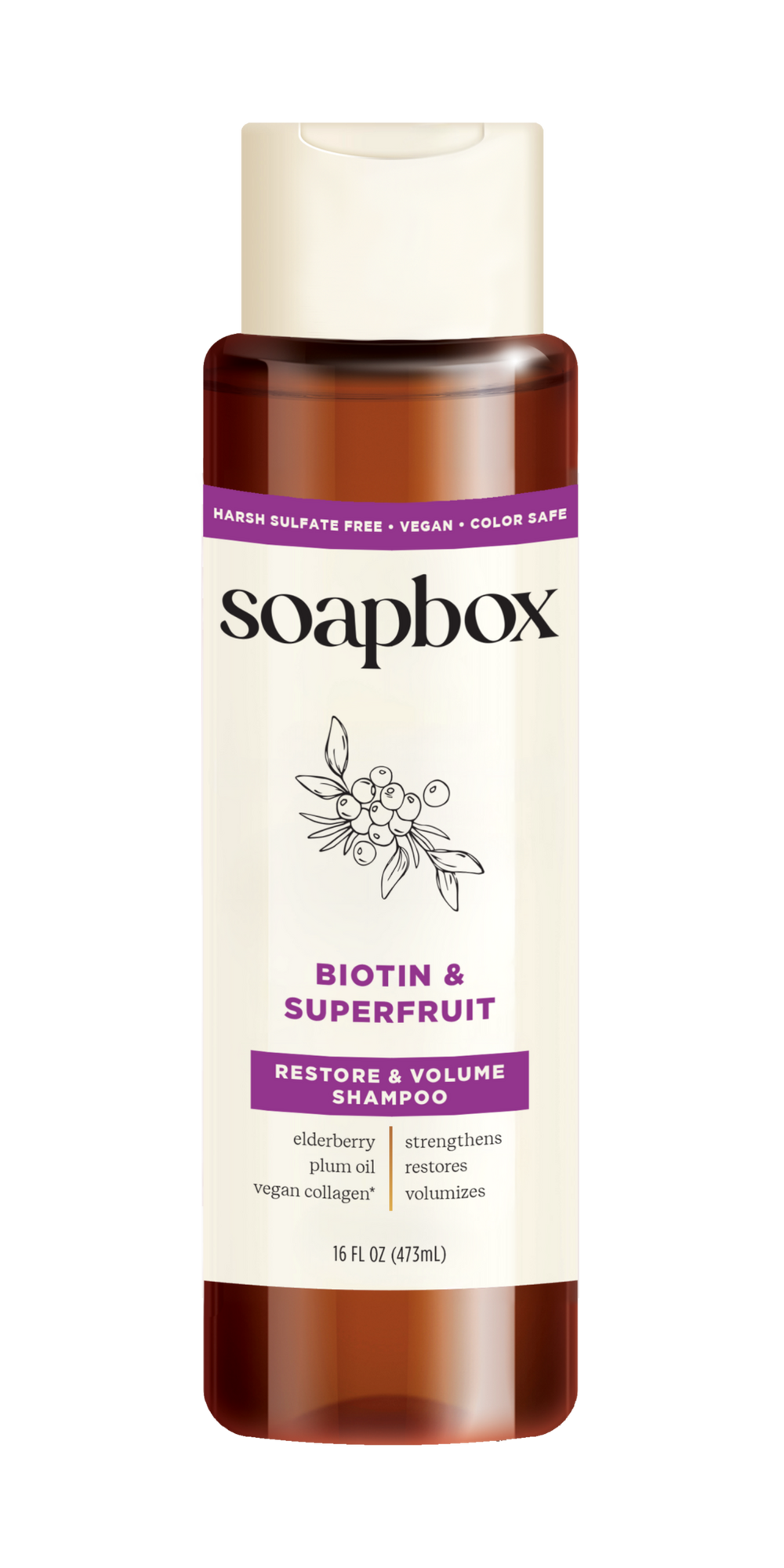 Biotin & Superfruit Volumizing Shampoo 1. Benefits: We're serving up a tall order of lush, full looks! Unlock thicker, voluminous, and healthy-looking hair. Weve blended biotin to support fullness, vegan collagen* to promote volume, and superfruits elderberry and plum oil to help strengthen and restore strands from damage. We've also supercharged this shampoo with a custom 5X vitamin complex for healthier hair made easy. This color-safe, volumizing shampoo is formulated for all hair types for both men and women, and is sulfate-free, silicone-free, paraben-free, phthalate-free, EDTA-free, gluten-free, cruelty-free, and vegan. For every Soapbox item sold, a bar of soap is donated to someone in need.. Features: DITCH FALLOUT AND SAY HELLO TO FULLNESS this wash will help give your hair a volumizing boost for fuller-looking restored strands.. 5X VITAMIN COMPLEX of vitamin B9 to help promote visible shine, Vitamin B5 to moisturize hair, Vitamin C to help nourish scalp, Vitamin B7 to promote fuller-looking hair, and Vitamin E to strengthen strands for healthier hair made easy.. BIOTIN B7: Promotes fuller-looking hair for healthier hair growth.. VEGAN COLLAGEN: Supports plumper, volumized hair.. ELDERBERRY: Antioxidant-rich to help strengthen strands from brittle and damaged to fortified.. PLUM OIL: Packed with vitamin E to help restore and revive hair.. MADE IN THE USA, Cruelty-Free, Vegan and Gluten Free. Free from harsh sulfates and chemicals, parabens and phthalates.. MAKE A DIFFERENCE your purchase of this Soapbox product also donates a bar of soap to someone in need either locally or abroad, supporting our mission to make hygiene essentials accessible to everyone. Track your donation with the Hope Code on the back of your product.. :