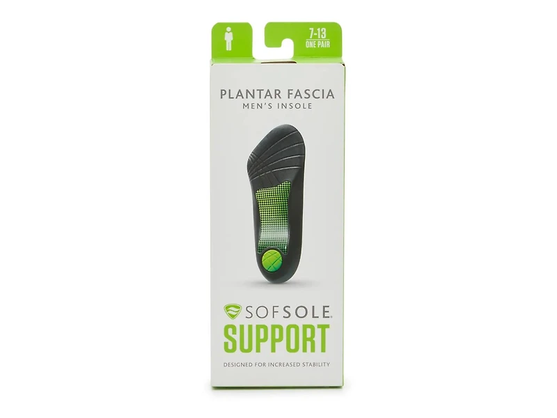 Help ease plantar fascia pain and stay comfortable in the Sof Sole Support Plantar Fascia insole. The plantar relief bridge design, moisture-wicking and odor-controlling materials, and stabilizing gel heel cup combine for an arch supportive fit.