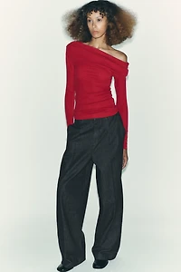 Top with draped asymmetric neckline and long sleeves. Straight hem.