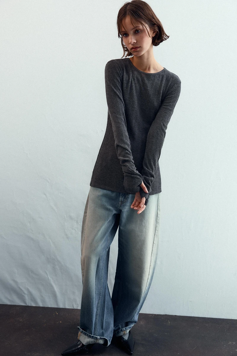 Round neck, long sleeve T-shirt. Soft ribbed fabric. Straight hem.