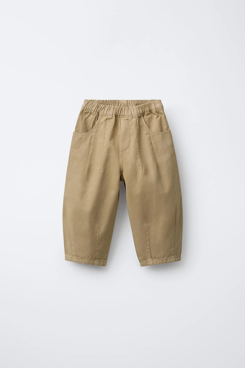 Baggy pants with elastic waistband. Front pockets and back patch pockets. Front pleats.