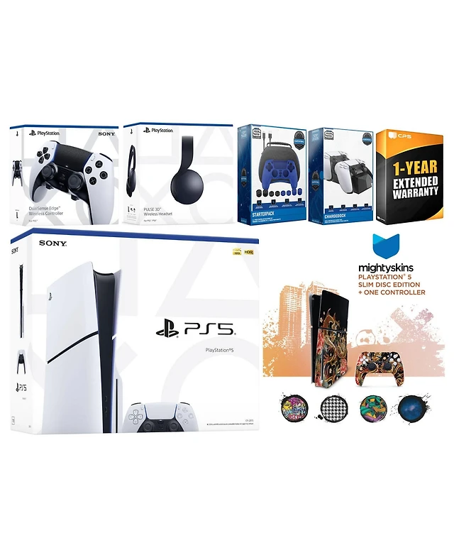 Sony Playstation 5 Slim Disc with Black Pulse Headset, Extra Edge Controller, Gamer Kit, Charge Dock and MightySkins Decal Voucher + 1 Year Cps Extend