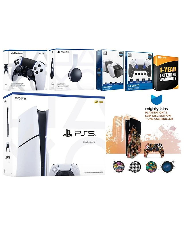 Sony Playstation 5 Slim Disc with White Pulse Headset, Extra Edge Controller, Fps Grip Kit, Charge Dock and MightySkins Decal Voucher + 1 Year Cps Ext