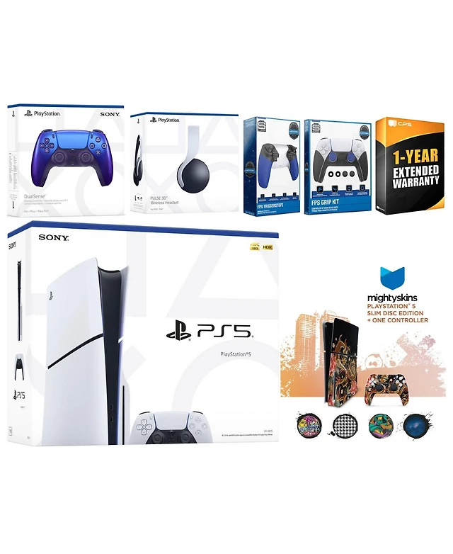 Sony Playstation 5 Slim Disc with White Pulse Headset, Extra Volcanic Red Controller, Trigger Stop Kit, Fps Grip Kit and MightySkins Decal Voucher + 1