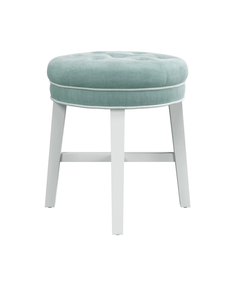 Retro design gets a modern facelift in the Hillsdale Furniture Sophia Vanity Stool. Classic button tufted design is updated with a trendy Spa Blue upholstery and genial White piping. The corresponding White finish solid hardwood legs feature an X-shaped stretcher that ensures this vanity stool will hold up to daily use for years to come. Perfect as a vanity seat in the bedroom and bathroom or as an ottoman in any room of the house. Some assembly required.