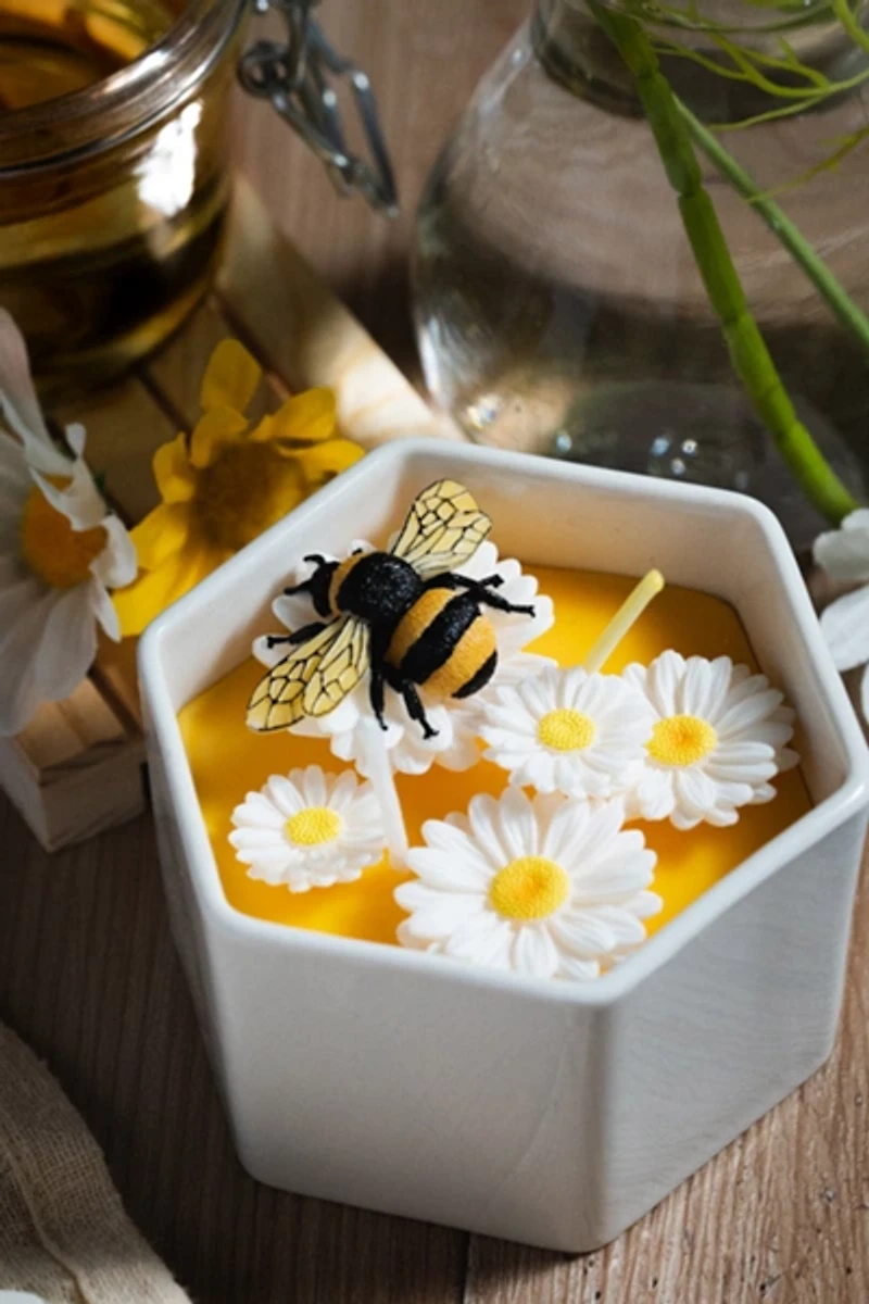 • Inspired by the sweetness of spring mornings, this handmade candle brings together golden honey tones and soft white daisies in a hexagon bowl reminiscent of a beehive. Each piece is hand-poured and hand-painted, featuring four delicate marguerite flowers and one cheerful bee collecting nectar on top. The honey-scented wax fills your space with cozy warmth and quiet joy — a tribute to nature's small wonders.