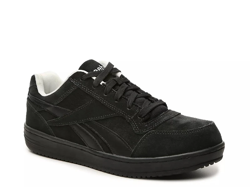 Work in all day comfort and safety with the Soyay steel toe sneaker from Reebok. This sporty work shoe features a cushioned insole and is oil and slip resistant.