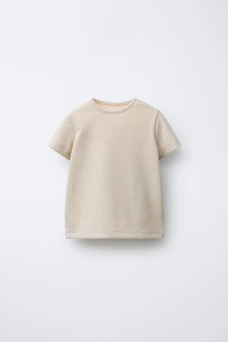 Ribbed T-shirt with a round neck and short sleeves. Sparkly detail. 40% cotton fabric.