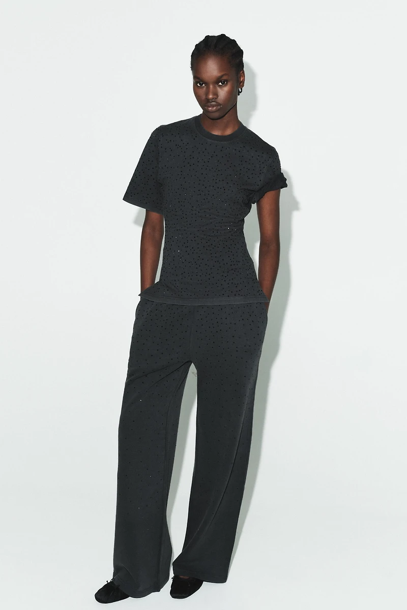 Top with main fabric made of cotton yarn. Round neck and short sleeves. Sparkly appliqué detail. Straight hem.