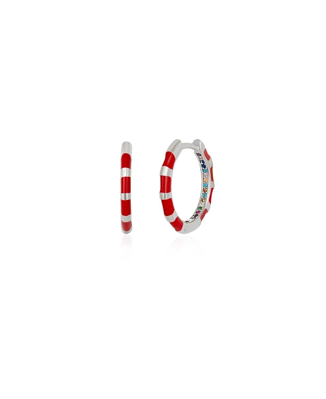 Spero London Enamel Red Fine Stripe Sterling Silver Hoop Earrings With Multi Color Zirconia Interior