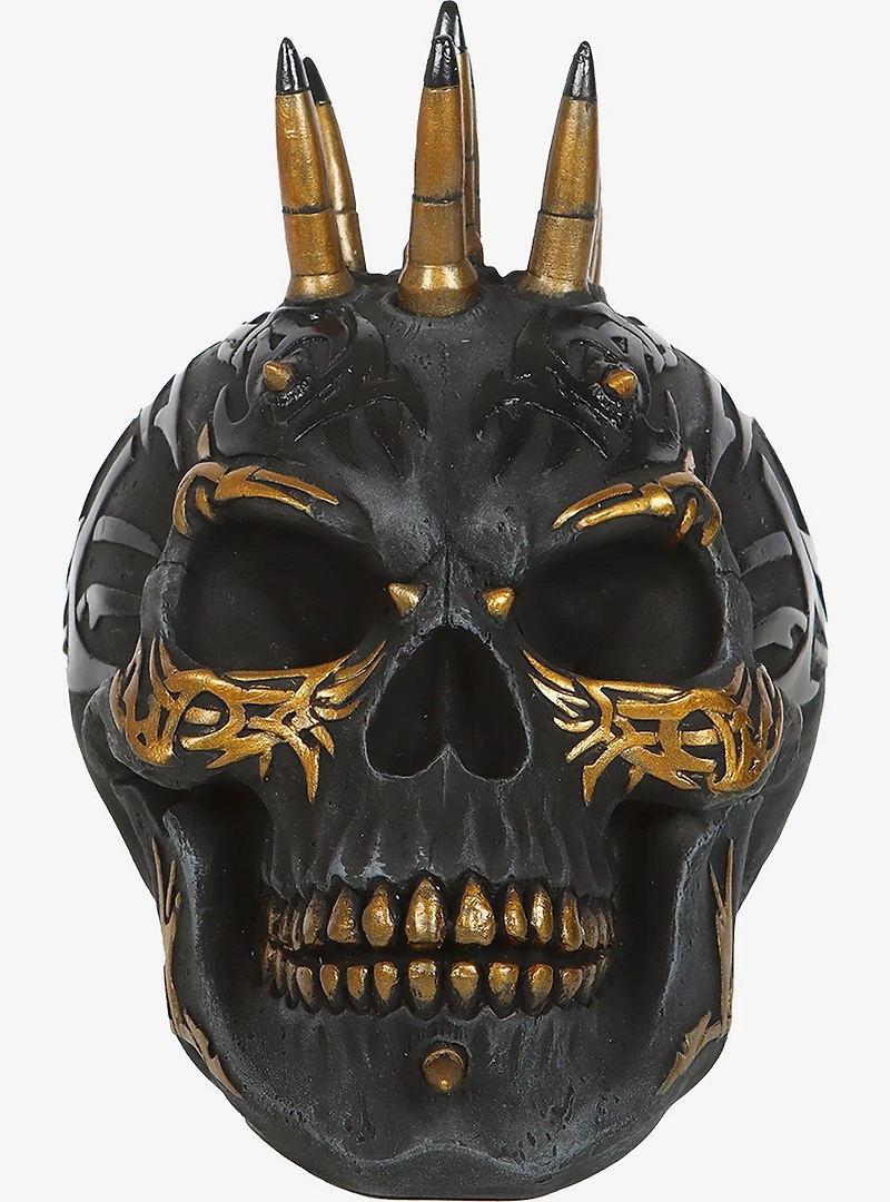 The ink-black pallor of midnight envelopes a skull in the darkness, accentuated with tribal engravings and the shimmer of molten gold. Death finds no solace in the decaying fortunes of the afterlife. Highly detailed, hand-painted decorative resin sculpture - perfect for use in your office as a rock and roll paperweight, or as a purely ornamental object to brighten up your home. This item has been cast from an intricately hand-crafted original clay sculpt, lovingly created by a skilled three-dimensional artist for Spiral Direct Ltd. Item cannot be shipped to P.O. Boxes