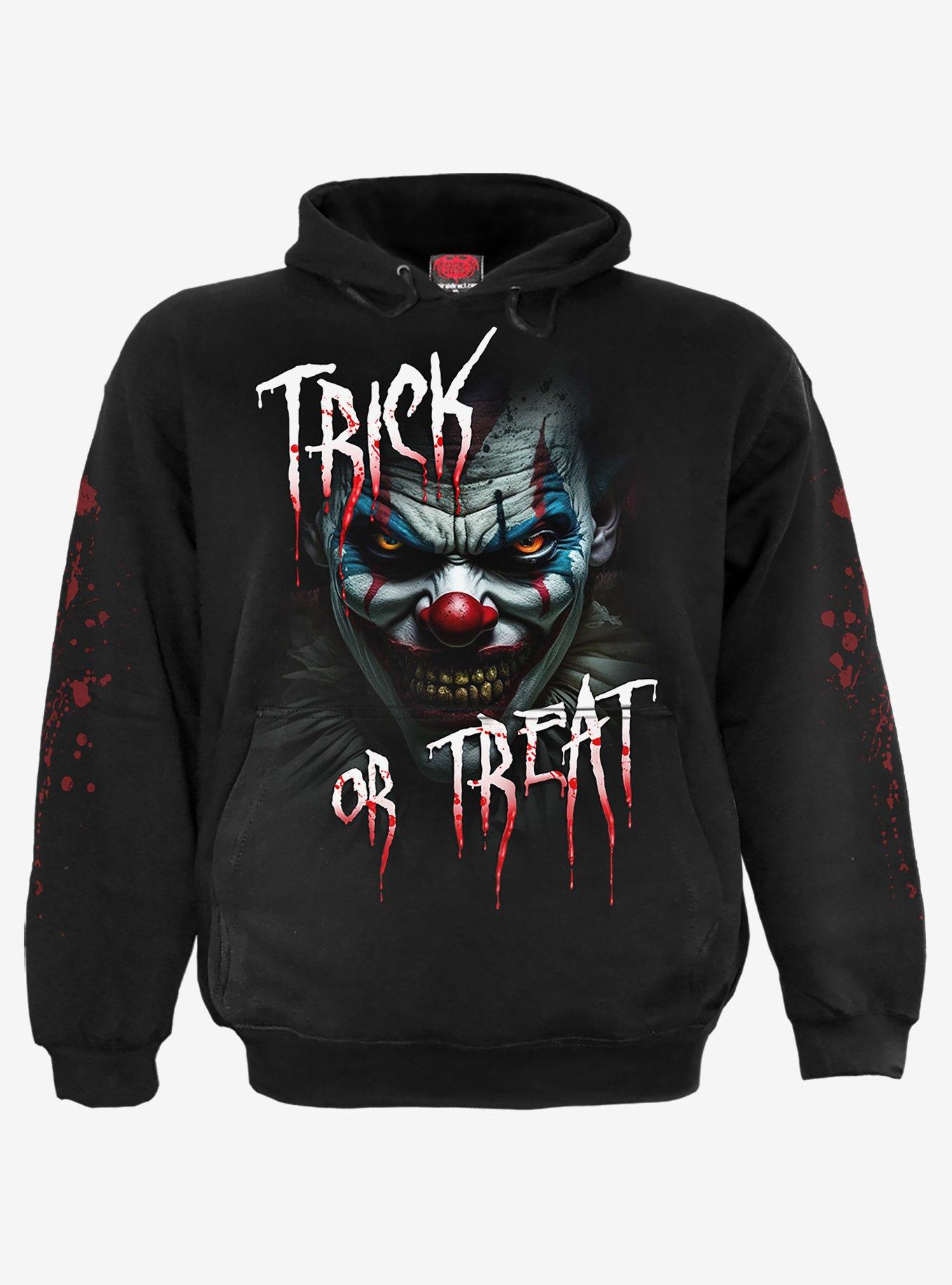 Be warned should you choose to go clowning around this Halloween. Within the steady stream of trick or treaters lining the amber-lit streets to collect their sweets there walks a demonic presence, searching for its next victim. The leaves fall, tumbling to the ground below just like the droplets of blood from a sharpened blade. Trick or Treat? Pray it's the latter, or your blood's gonna splatter! Spiral Trick Or Treat Hoodie Black is made of Top Quality 100% Cotton, Fleece using skin friendly, Azo-free, Reactive dyes. Item cannot be shipped to P.O. Boxes