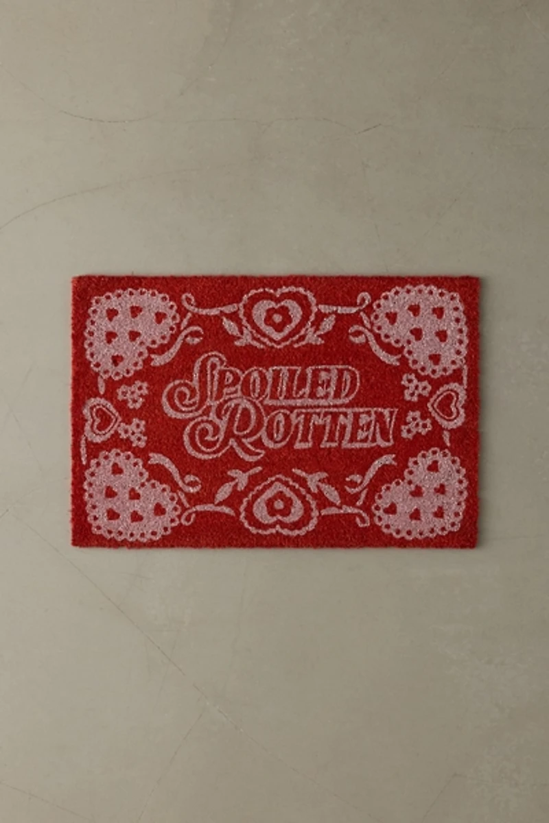 Inspired by vintage Valentine’s, this coir welcome mat features Spoiled Rotton text paired with heart-shaped motifs allover. Available exclusively at Urban Outfitters.