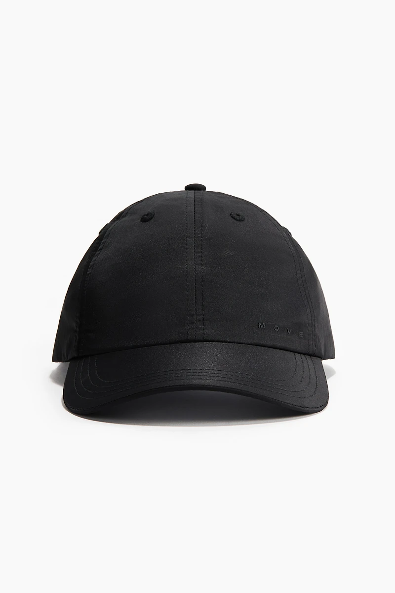 Sports cap with embroidered eyelets, a sweatband, and an elasticized, reflective drawstring at back with plastic cord stopper.