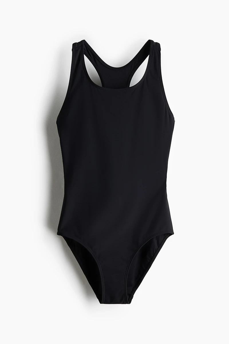 Fully lined swimsuit, ideal for water sports and swimming. Racer back, round neckline, and a cutout section at back.
