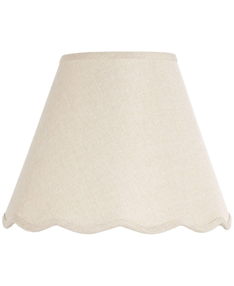 A hardback empire lamp shade offers an elegant aesthetic with its scalloped bottom edge. Covered in a beautiful white linen fabric, this scalloped empire shade puts off a bright and soothing glow across tables and more. The polished brass finish spider clip fitter ensures a hint of warm metallic and a solid fit to customize a medium size table lamp. Recommended for use with 25 watt candelabra base bulbs. From the Springcrest brand of designer lamp shades.