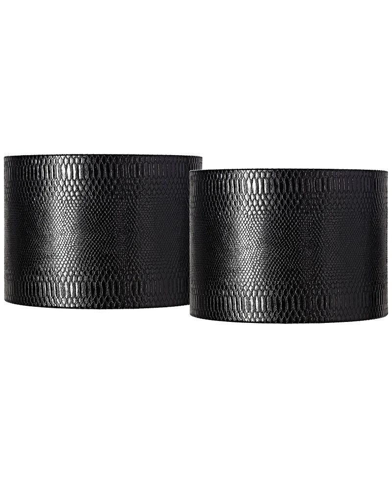 An opaque reptile print with a rolled edge creates a clean and modern look for this set of two drum lamp shades. A silver foil lining creates a metallic look for a stunning effect. Light throw is directed up and down for a focused look and a harp and finial are included with each shade.