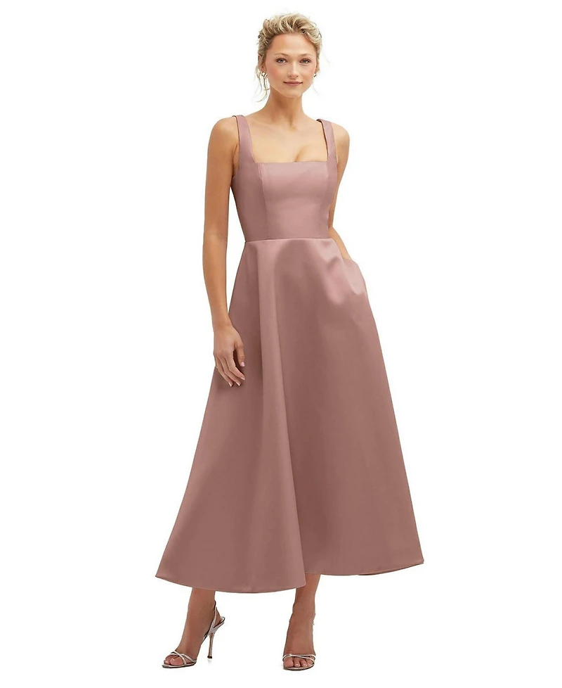 Square Neck Satin Midi Dress with Full Skirt & Pockets